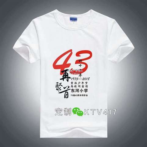 畢業43年同學聚會文化衫圖案,聚會衣服采用的是白色的文化衫,文化衫正面印刷紅色的藝術字43,四十三年