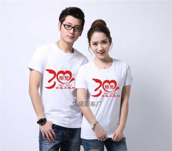 針對畢業同學聚會t恤圖案設計圖片,對于30年的聚會,聚會人員都是50多歲的人了,大花大紫的文化衫顏色已經不適合,對于文化衫顏色的選擇大多數是白的為主,紅色的文化衫為輔。也有做藍色的,但相對較少。